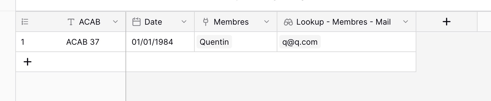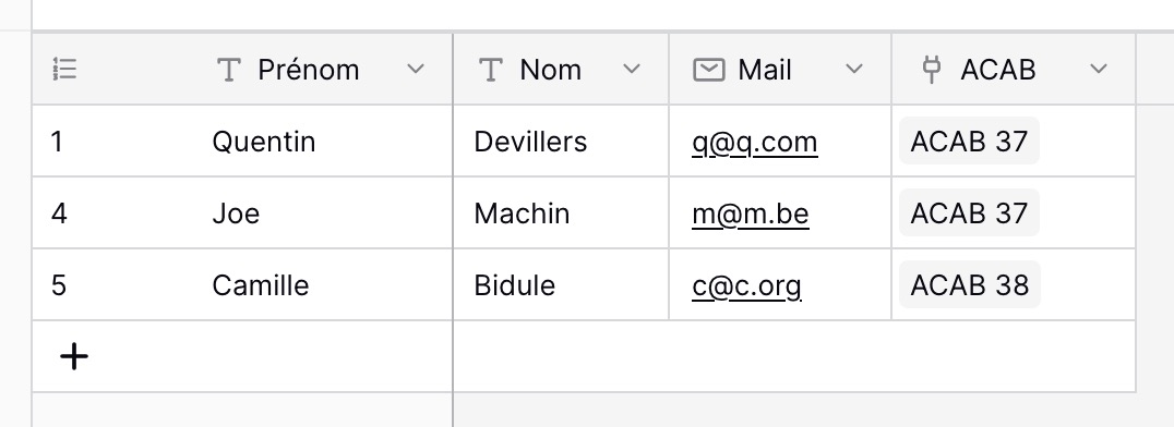 - automatiquement s'affichera "ACAB 37" à la colonne 🔌"ACAB" et à la ligne "Quentin" dans la table Membres.